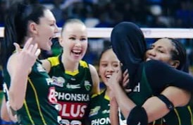 Sebuah spike tajam Annie Mitchem memastikan kemenangan Phonska Plus di set keempat dengan skor 25-19.